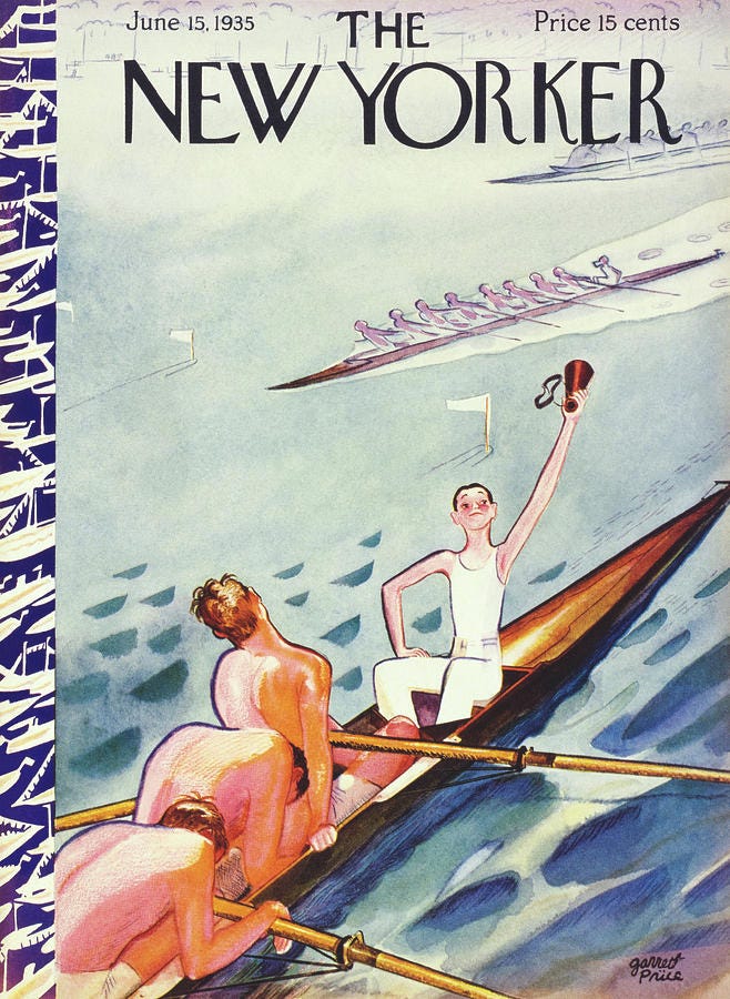 A rowing team collapses in exhaustion while their coxswain raises a limp arm in victory. The paint still glistens with sweat. Look at it long enough and you can almost hear the coxswain’s ragged voice, the summer heat pressing against the river, the pride that feels immense and fleeting at once. A week later, a new cover replaced it. But here it is again, suspended.